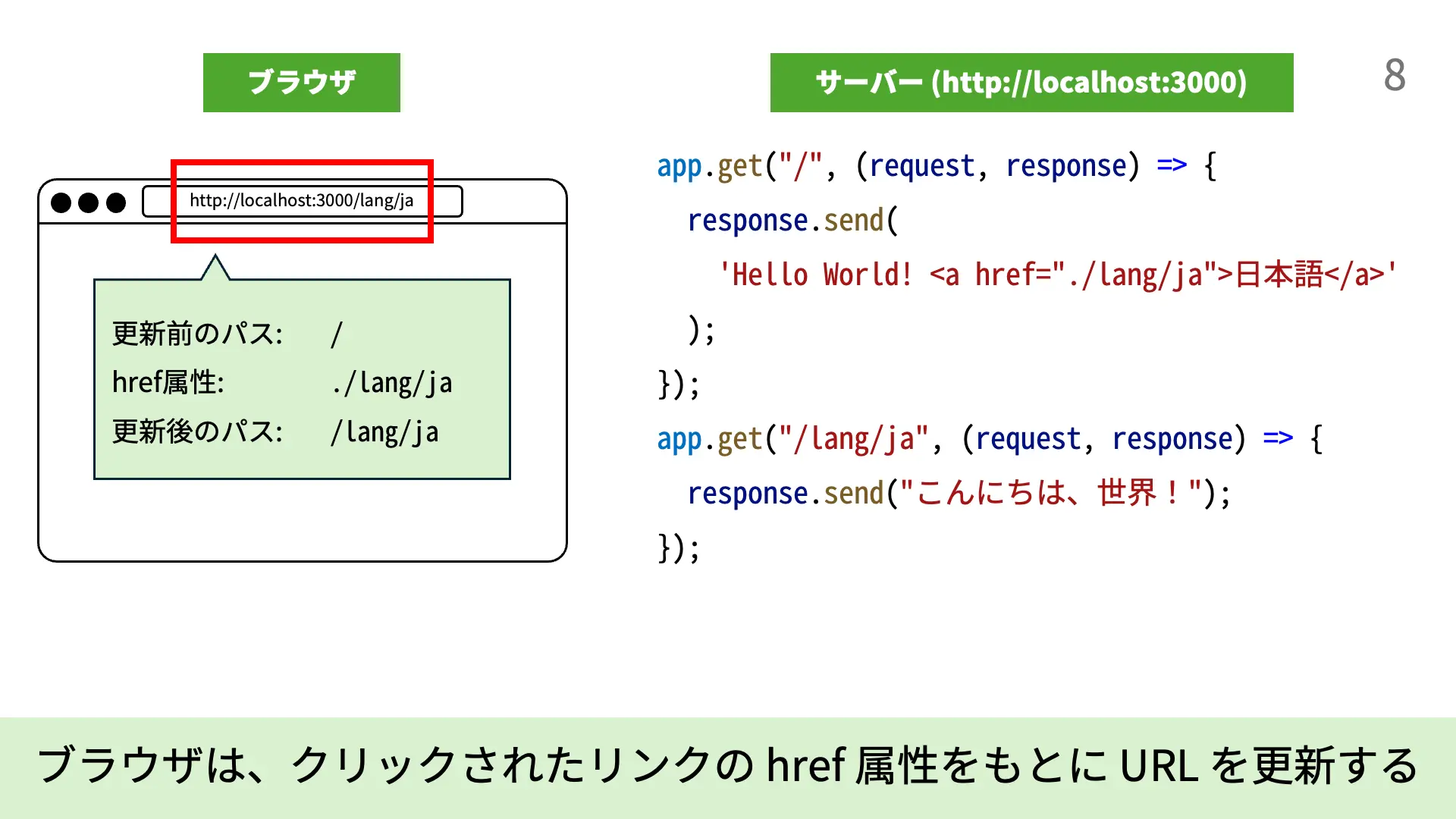 href属性をもとに、アドレスバーのURLを更新し、ページ遷移を起こします。href属性にプロトコルを含むURLが指定されていれば、そのURLに遷移します。href属性が相対パスの形式で指定されていれば、現在のパスを基準にLinuxにおける相対パスと同様の方法でURLを更新します。この例では、更新前のパスが/で、href属性には./lang/jaが指定されているため、更新後のパスは/lang/jaになり、URLはhttp://localhost:3000/lang/jaに変化します。